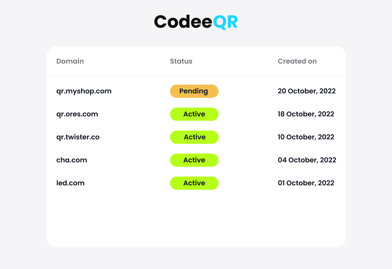 If it has been more than one business day and you have not received any updates or communication from us, please [<mark style="color:blue;">contact us</mark>](https://codeeqr.com/contact/) to inquire about the status of your domain.